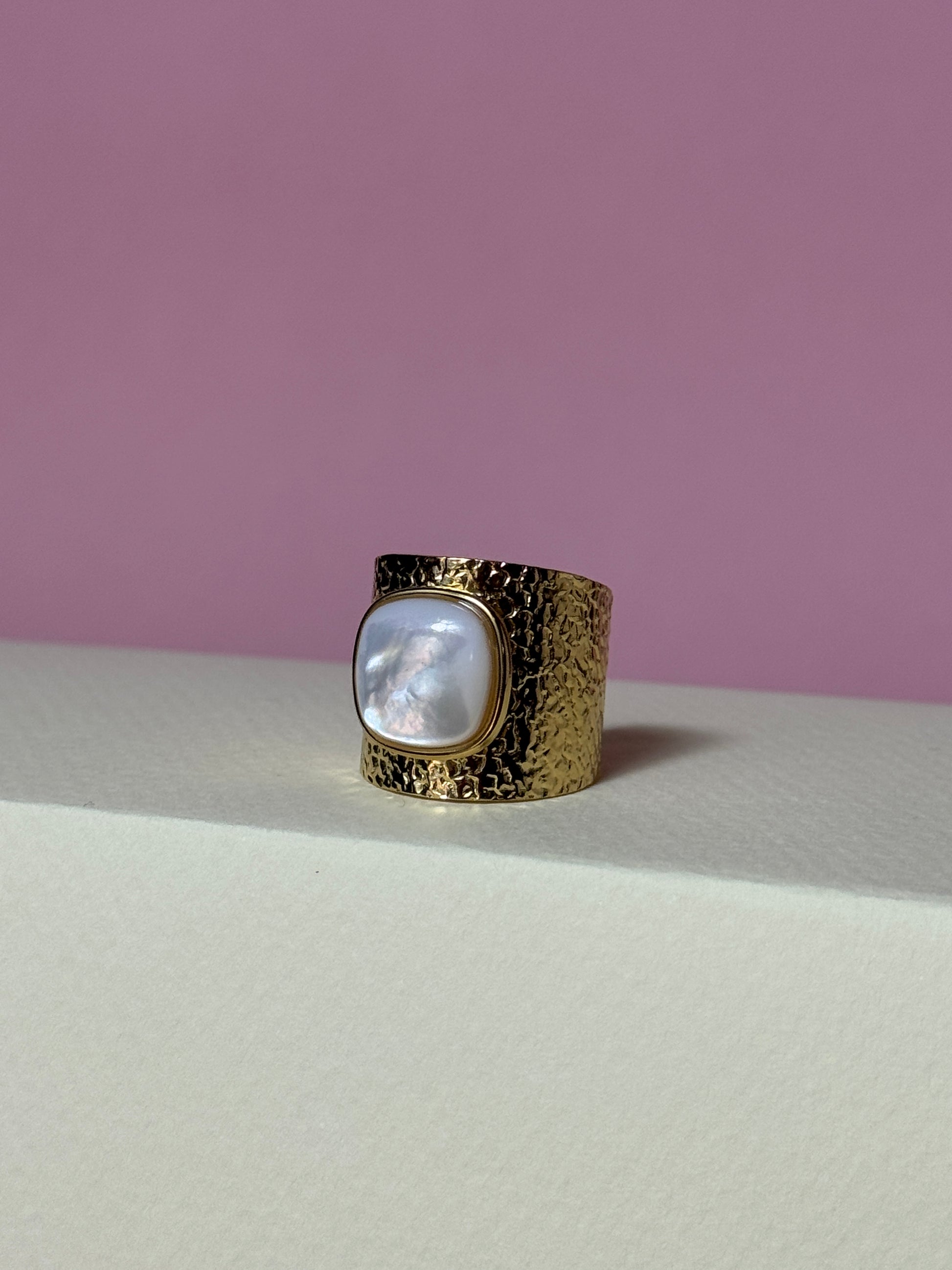 Inspirée des dorures majestueuses du Palais Garnier, cette bague martelée est ornée d'une pierre lumineuse, rouge profond ( cornaline ) ou blanc nacré ( nacre ). Une pièce sculpturale qui capte la lumière à chaque mouvement.