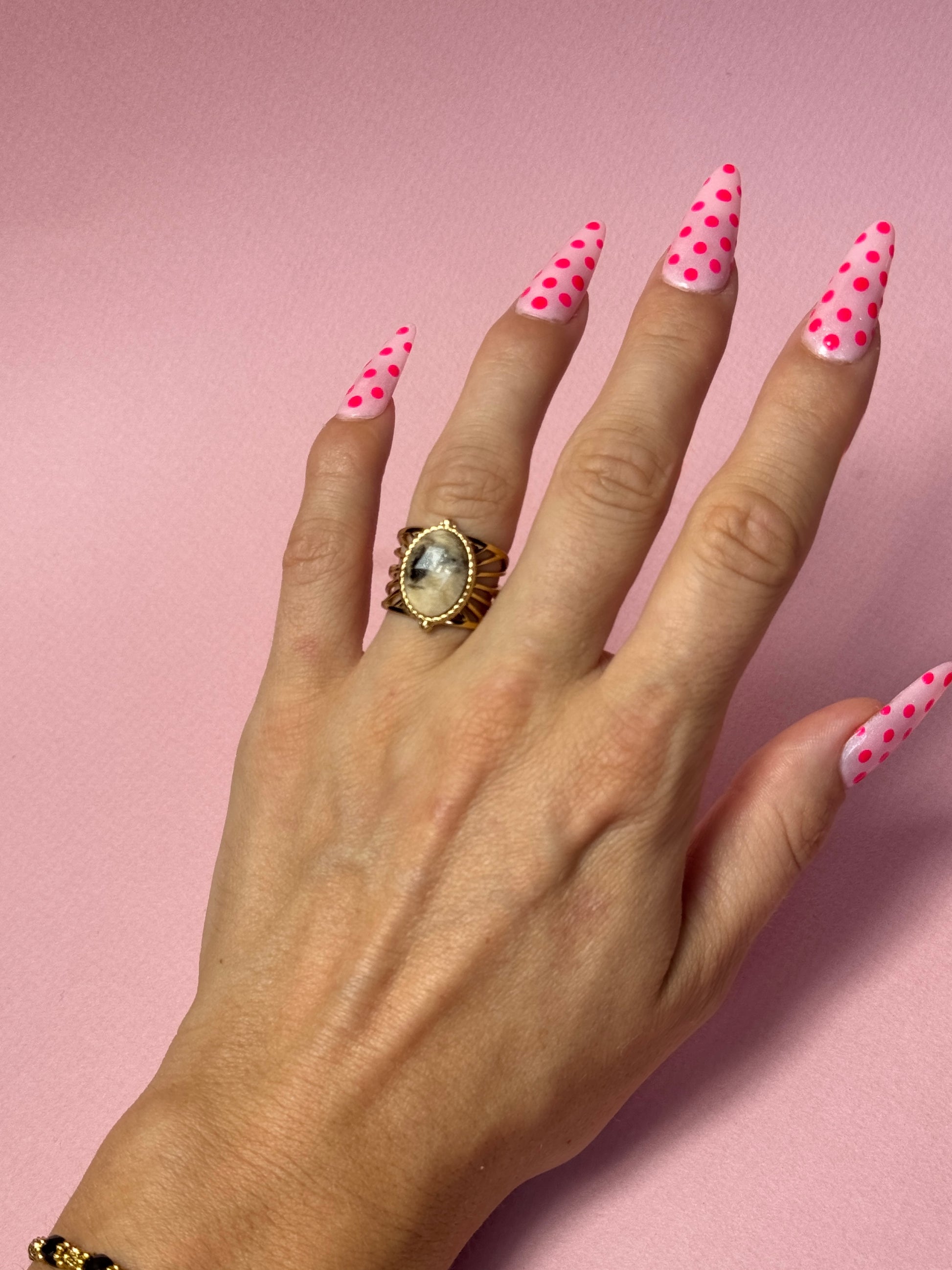 Elégante et raffinée, cette bague en jaspe marbrée évoque les façades parisiennes et leurs détails sculptés. Une pièce intemporelles qui habille la main avec grâce.