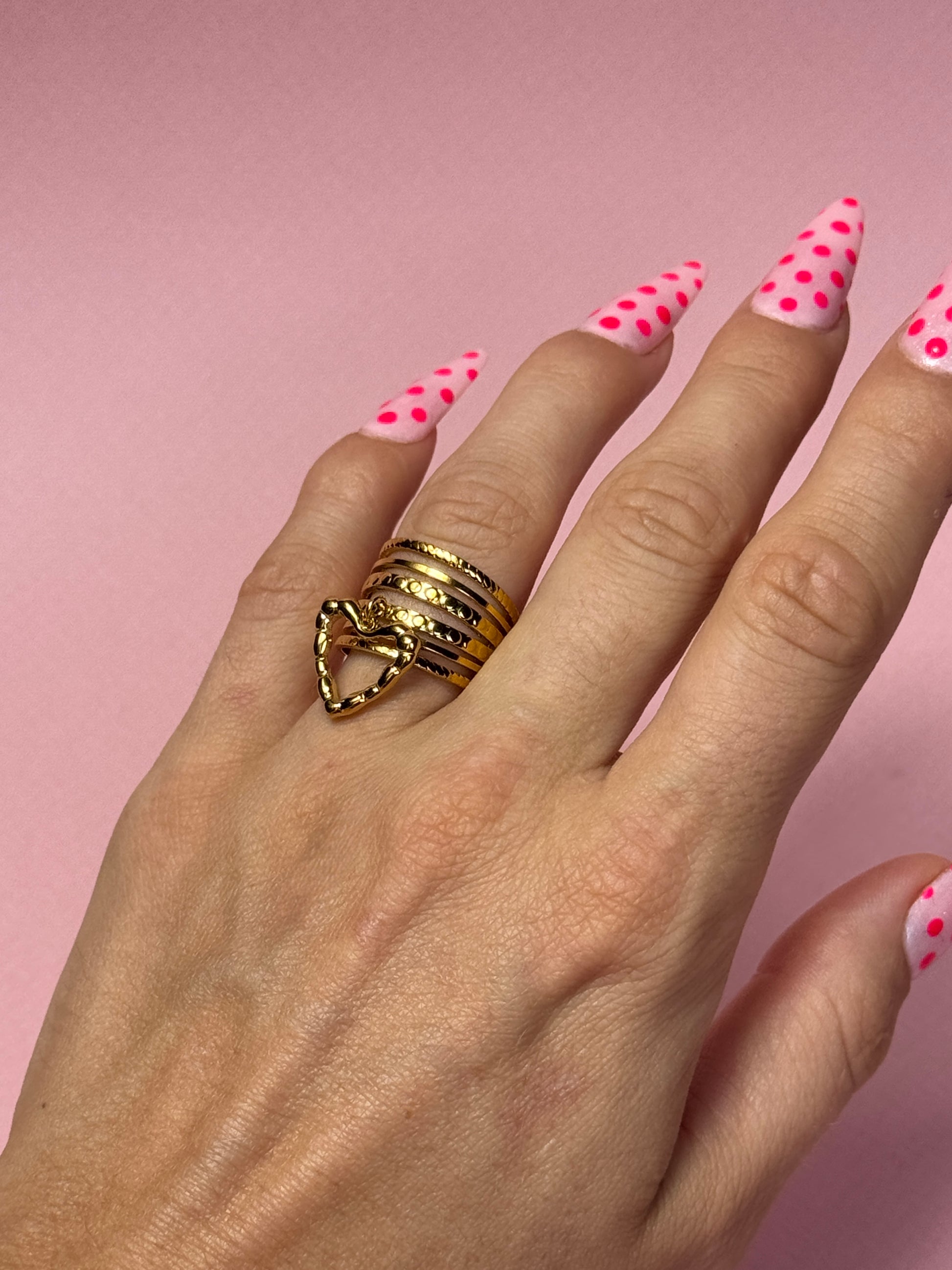 Audacieuse et séductrice, cette bague aux anneaux multiples est sublimée d'un coeur torsadé. Elle incarne l'énergie électrique et glamour de Pigalle.