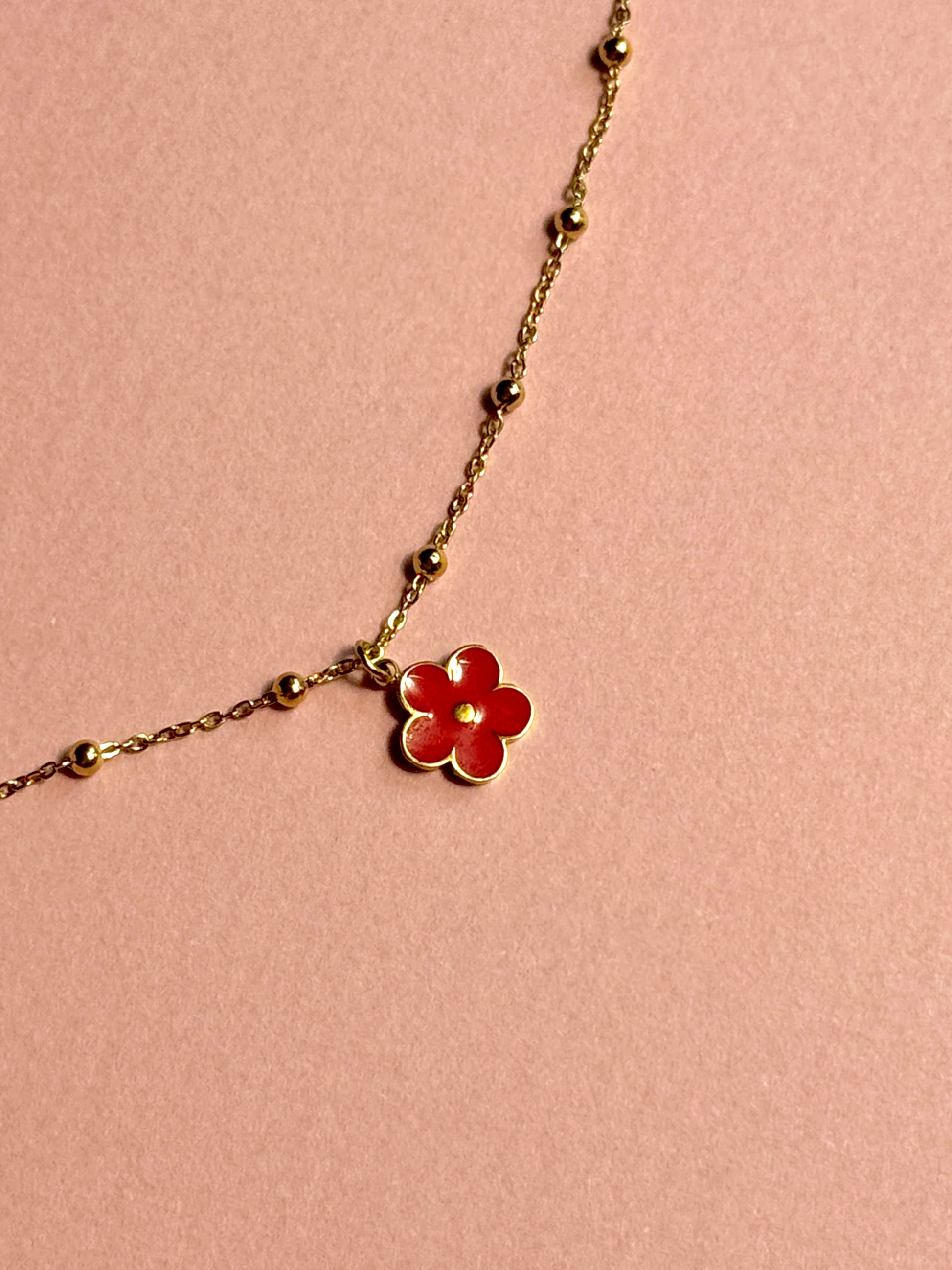 Collier chaîne doré avec boule et pendentif fleur rouge