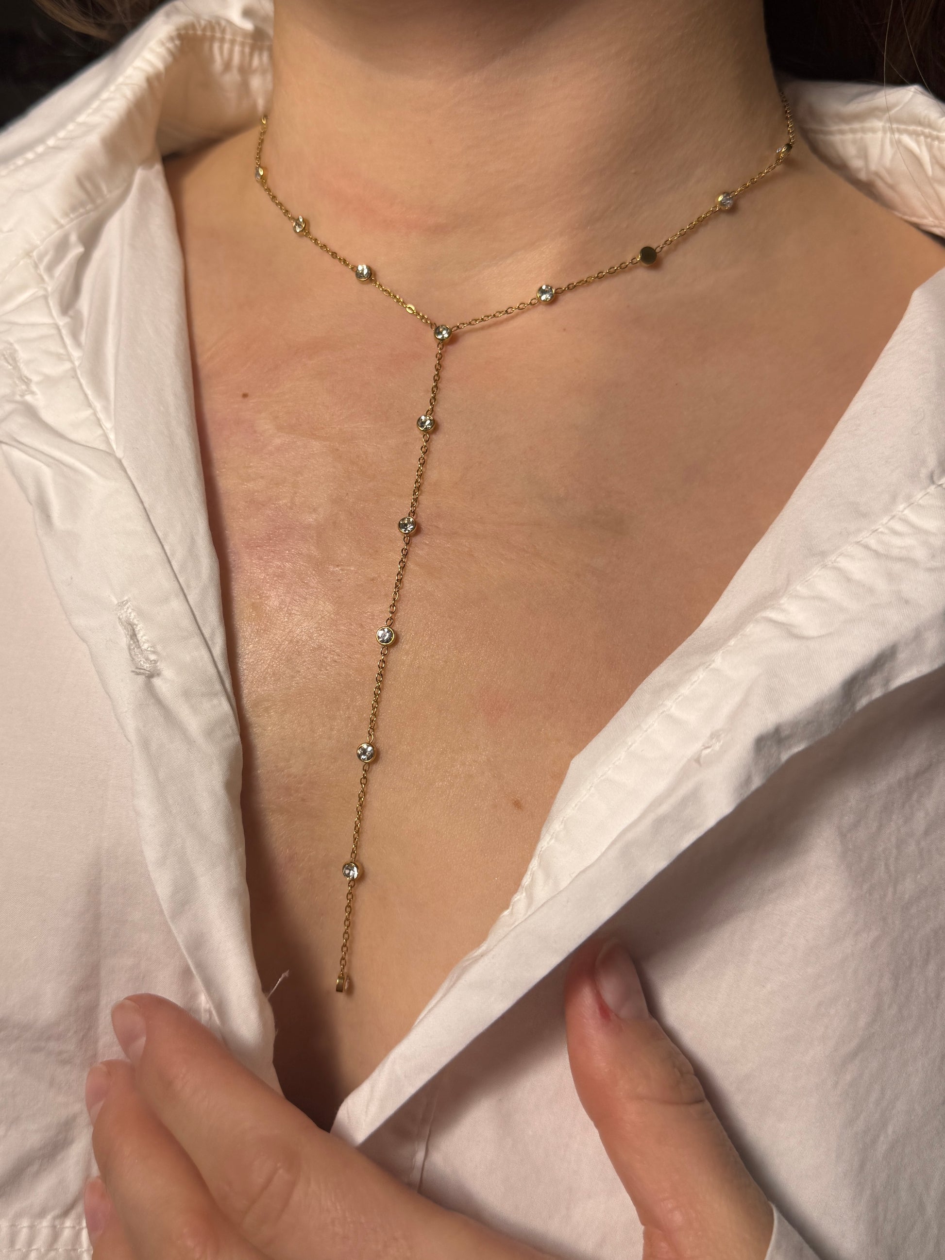 Un collier fluide, léger, très féminin. Les pierres rythment la chaîne et apportent une lumière subtile. Il habille le décolleté naturellement, sans effort. Un indispensable du quotidien.