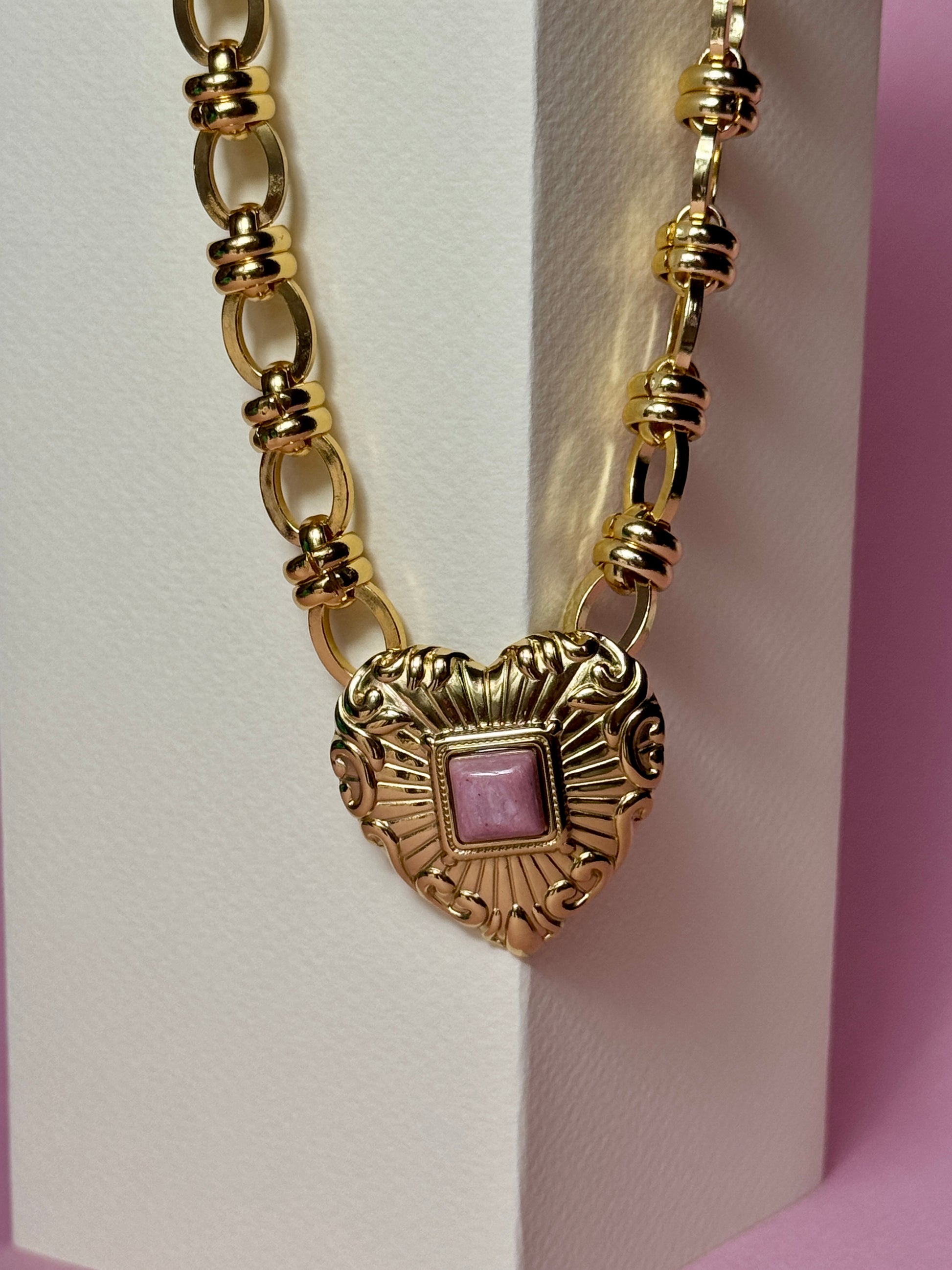 Un cœur majestueux doré, orné d’une pierre rose délicate, symbole de tendresse et de force. Inspiré de la rue des Rosiers, joyau du Marais, ce collier mêle romantisme et caractère. Une pièce talisman, pensée pour sublimer chaque tenue d’un éclat unique et intemporel.
