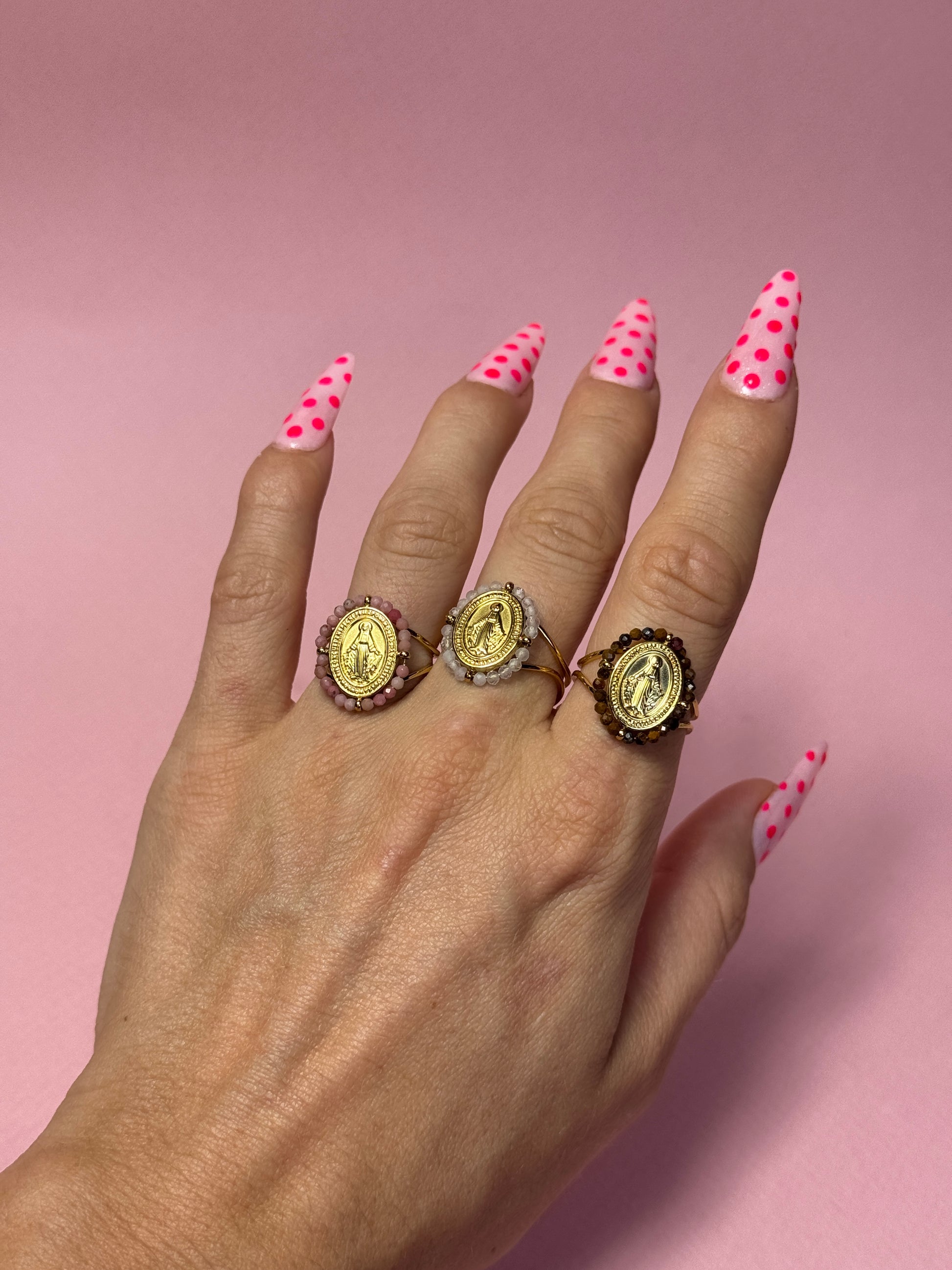 Iconique et protectrice, cette bague médaille bordée de parles fines se décline en plusieurs couleurs. Une pièce spirituelle et tendance, entre tradition et modernité.