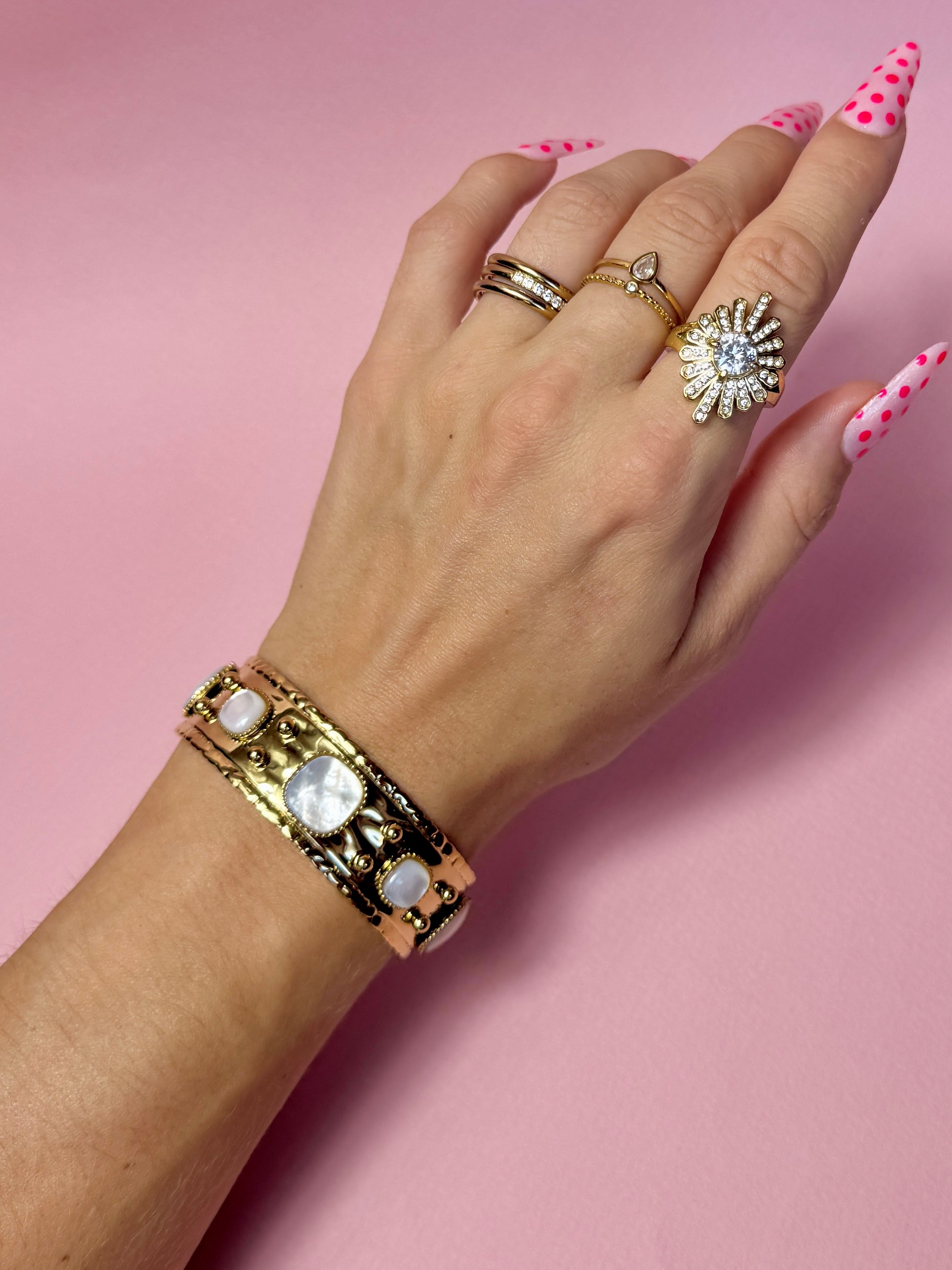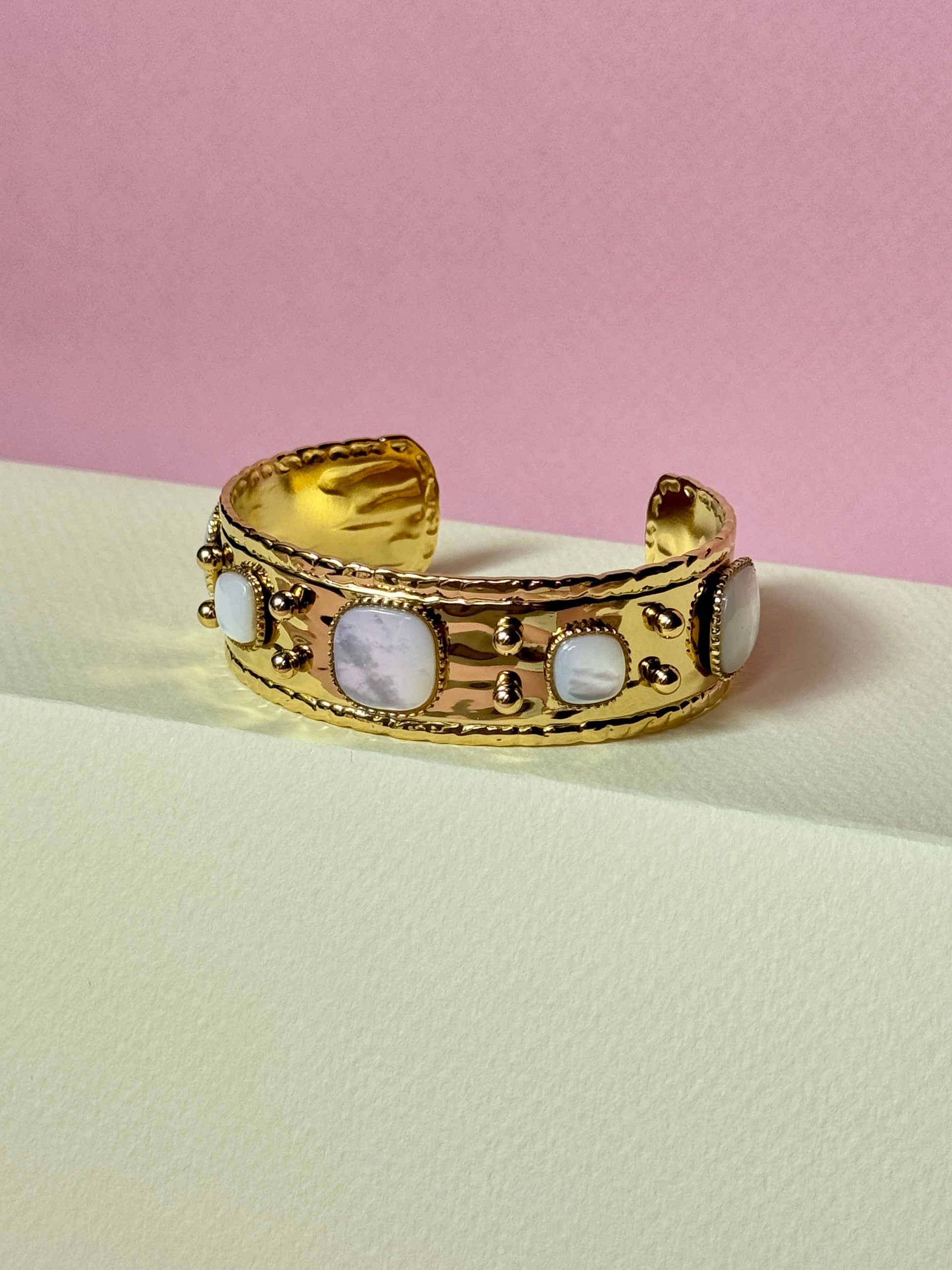 Inspiré des jardins parisiens, cette manchette aux pierres nacrées reflète la lumière avec douceur et majesté. Une pièce forte, féminine et raffinée.
